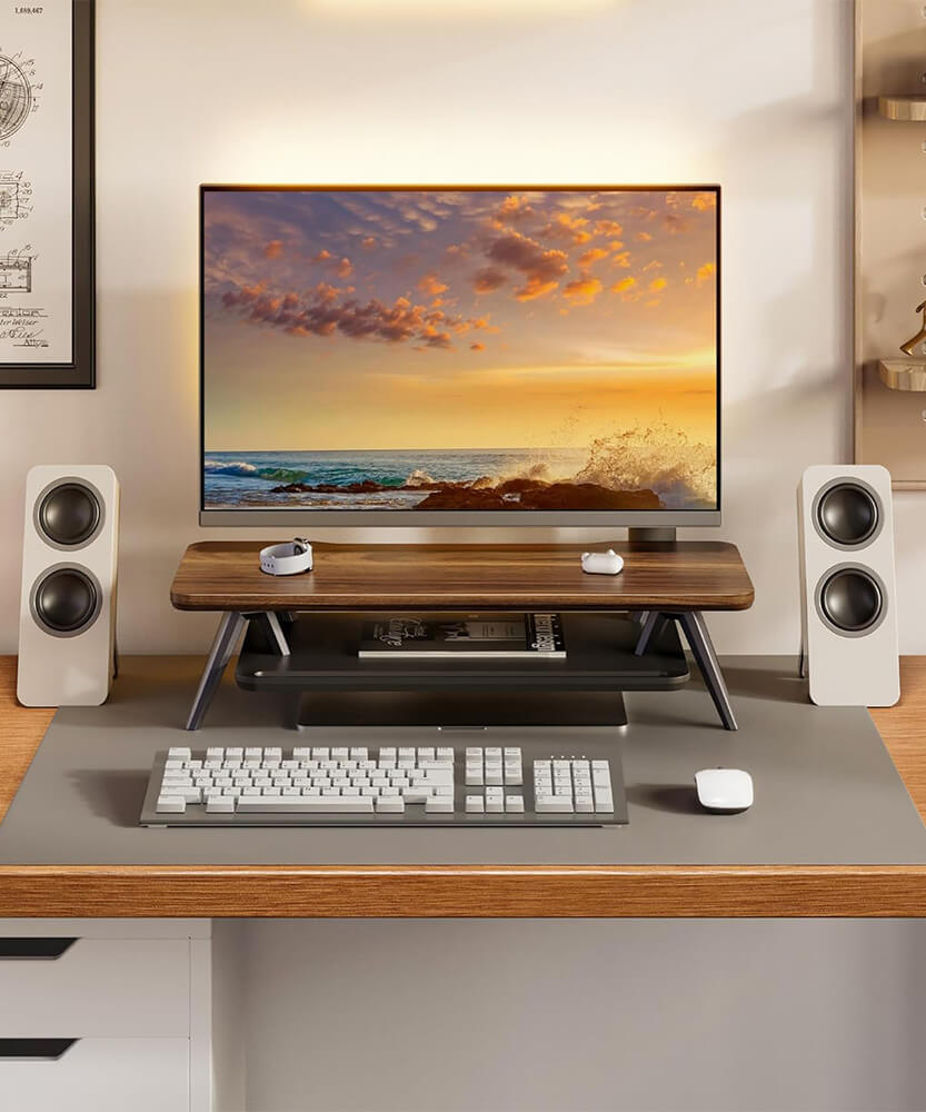 By lifting your monitor off the surface, a stand instantly creates more usable space beneath. Use it to store your keyboard, notebooks, or other desk essentials—keeping your workspace organized and efficient.