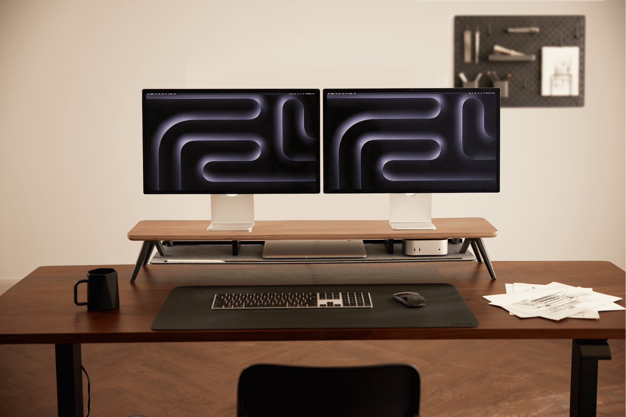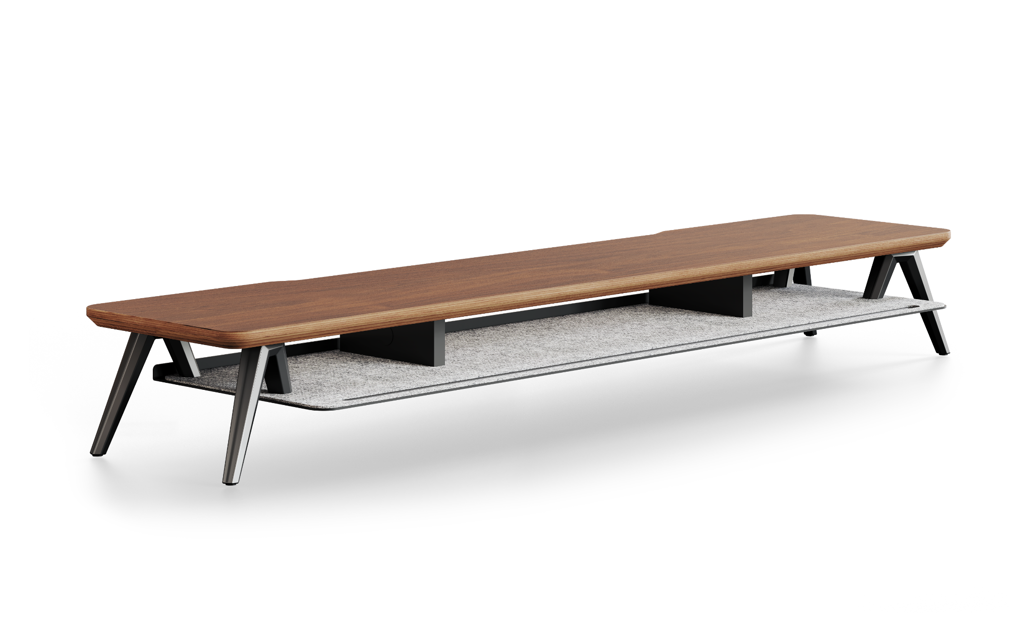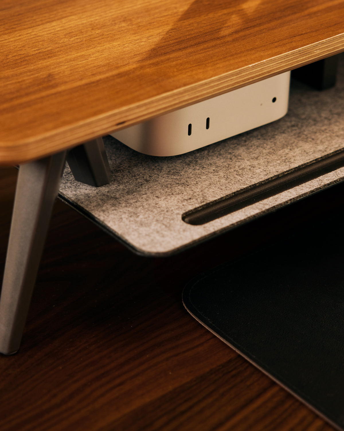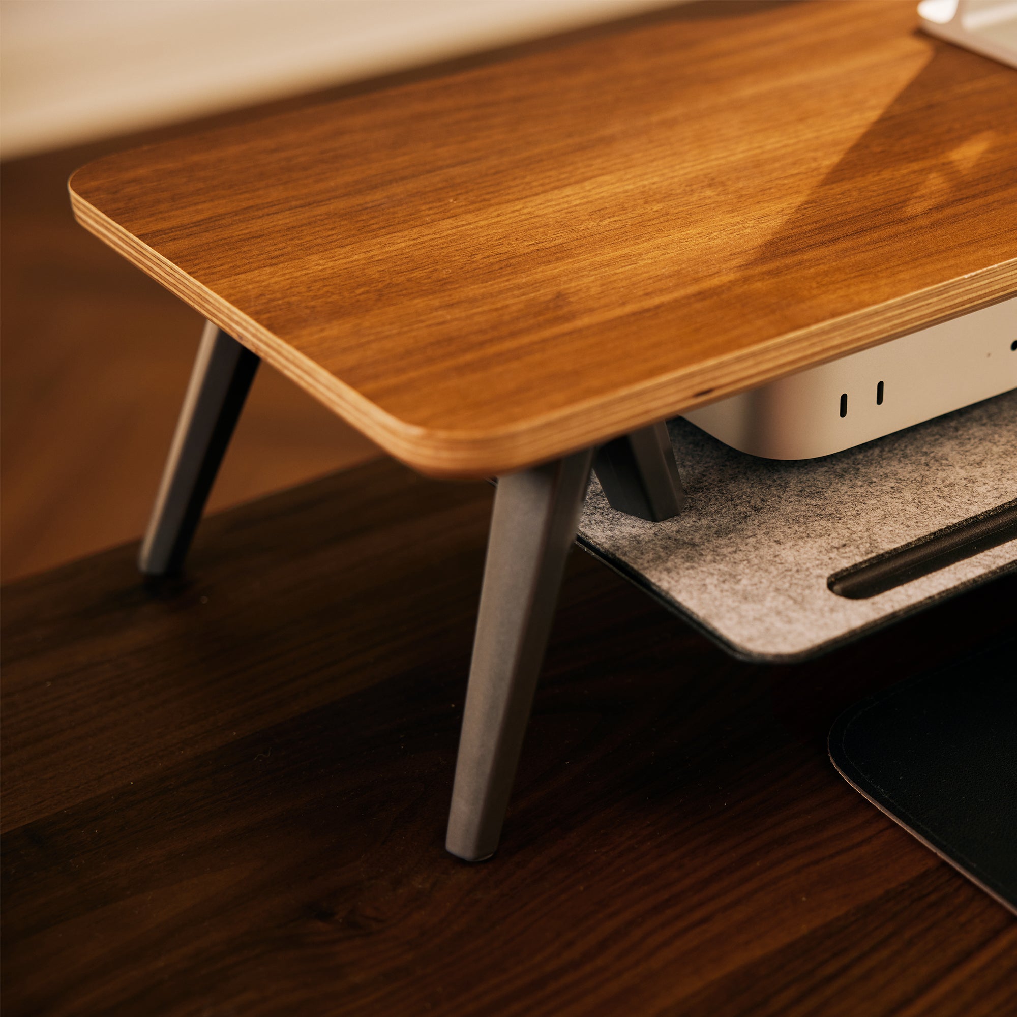 The hidden secondary shelf effortlessly stows hubs and notebooks, doubling your desk's usable area for a clutter-free mind.