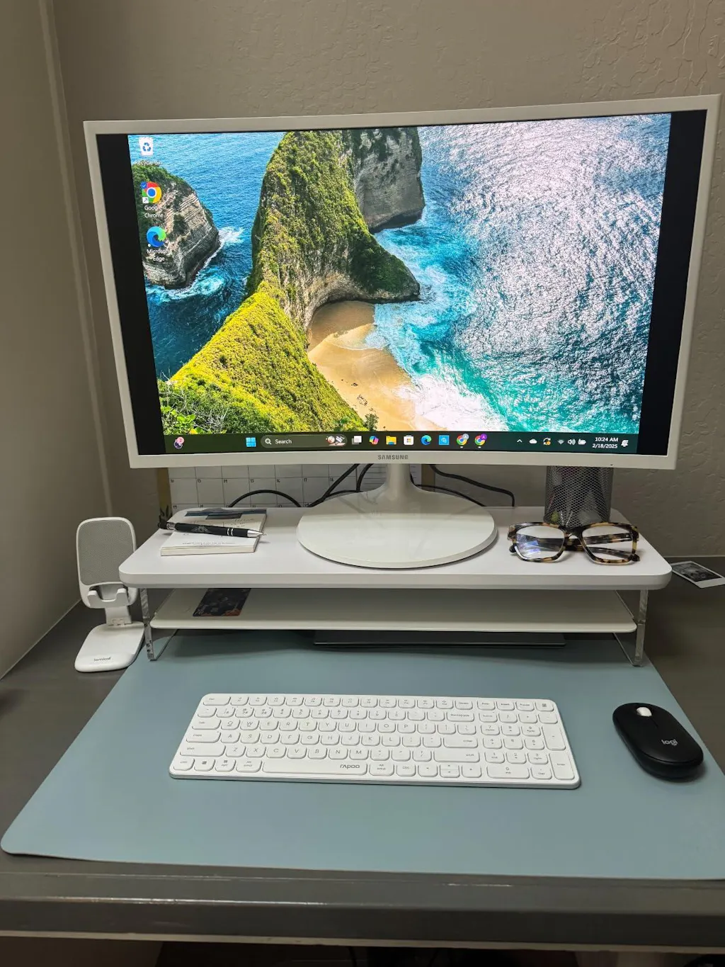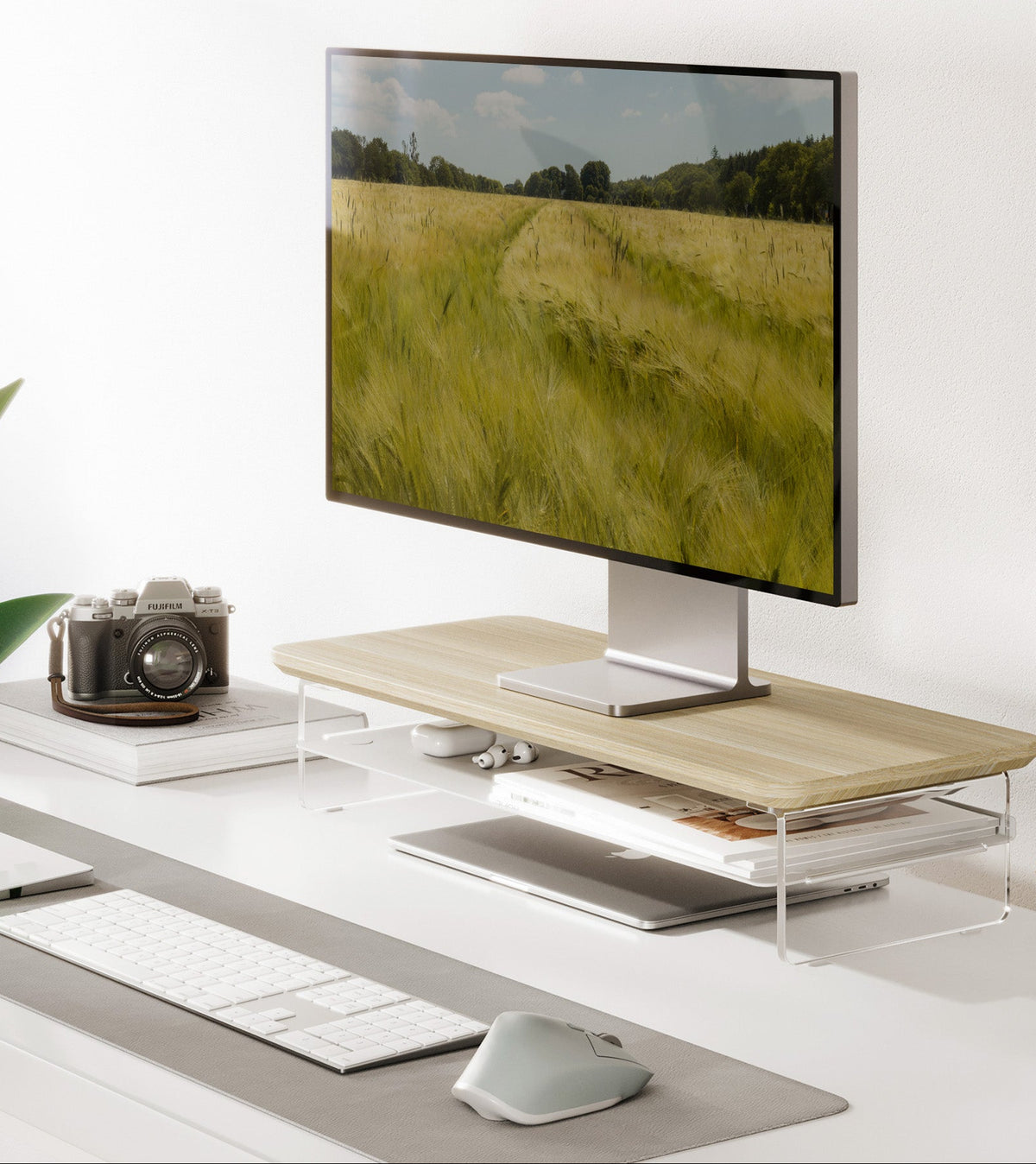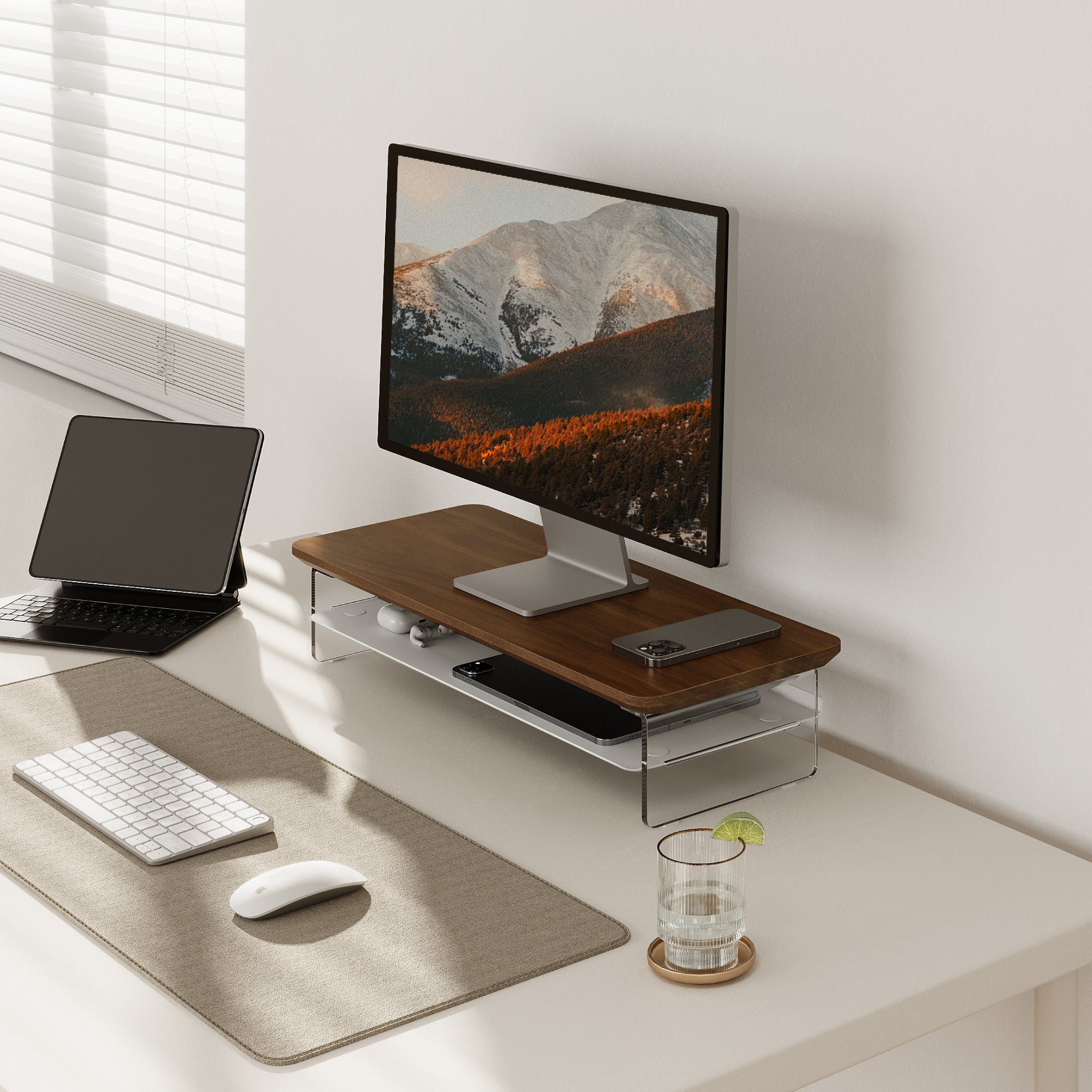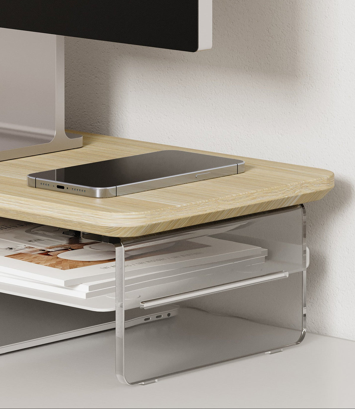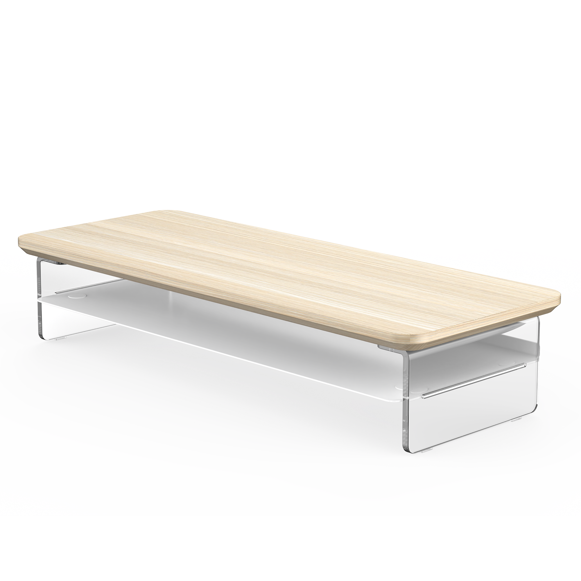Featuring transparent acrylic support legs paired with smooth, rounded wood, the design creates a visually light and airy feel, enhancing the style of the desktop and offering a classic and timeless aesthetic.